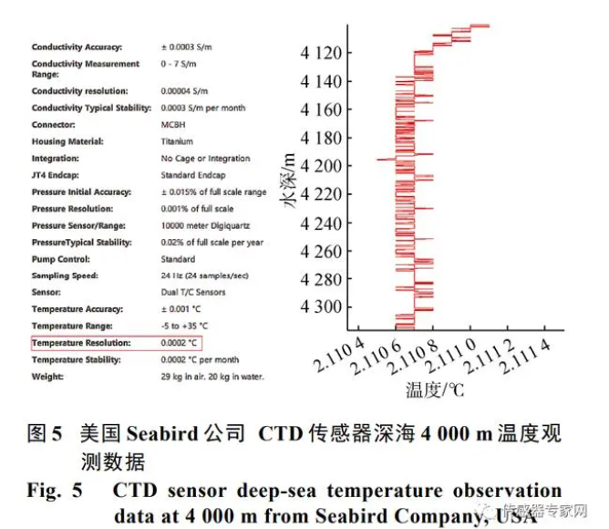 作為世界上最主流的 CTD 傳感器制造商美國 Seabird 公司的產品, 其溫度測量分辨率為0.000 2℃, 電導率測量分辨率為 0.000 05 s/m, 如圖 5 所示, 該型傳感器在4000 m 水深情況下, 已經無法很好地分辨微小的溫度和鹽度變化。針對此, 我國全海深科學考察所必備的全海深 CTD傳感器必須立足于自主研發。