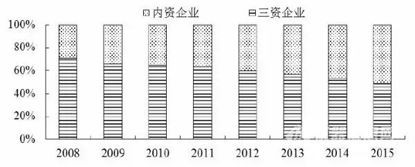 圖4內(nèi)資企業(yè)和三資企業(yè)高技術(shù)產(chǎn)業(yè)主營業(yè)務(wù)收入所占比重(2008-2015年)