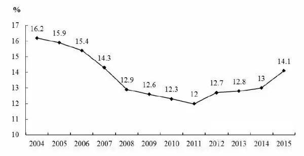 圖2高技術(shù)產(chǎn)業(yè)主營業(yè)務(wù)收入占制造業(yè)的比重(2004-2015年)