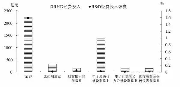 近年來中國高技術(shù)產(chǎn)業(yè)的R&D經(jīng)費(fèi)持續(xù)增長。2015年,大中型高技術(shù)產(chǎn)業(yè)企業(yè)R&D經(jīng)費(fèi)達(dá)到2219.7億元,占大中型制造業(yè)R&D經(jīng)費(fèi)的29.7%。高技術(shù)產(chǎn)業(yè)R&D經(jīng)費(fèi)投入強(qiáng)度為1.59%,比去年下降了0.2個(gè)百分點(diǎn)。航空航天器制造業(yè)的R&D經(jīng)費(fèi)投入強(qiáng)度最高,為4.9%,計(jì)算機(jī)及辦公設(shè)備制造業(yè)最低,為0.82%。