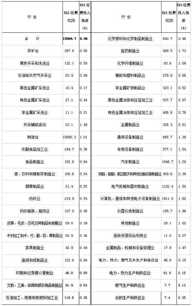 分產業部門看,高技術制造業研究與試驗發展(R&D)經費2915.7億元,投入強度(與主營業務收入之比)為1.9%;裝備制造業研究與試驗發展(R&D)經費6176.6億元,投入強度為1.51%。在規模以上工業企業[]中,研究與試驗發展(R&D)經費投入超過500億元的行業大類有7個,這7個行業的經費占全部規模以上工業企業研究與試驗發展(R&D)經費的比重為60.2%;研究與試驗發展(R&D)經費投入在100億元以上且投入強度超過規模以上工業企業平均水平的行業大類有9個(分行業情況詳見附表1)。