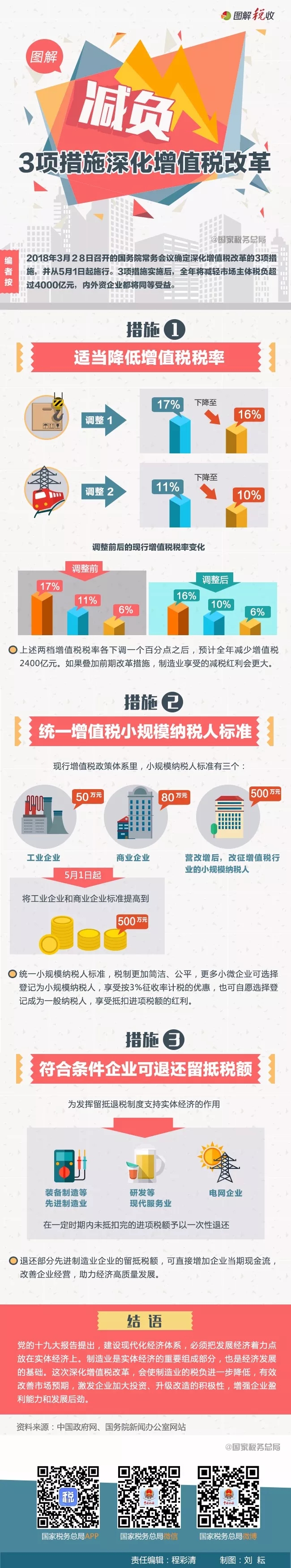 2018年3月28日召開的國務院常務會議確定深化增值稅改革的3項措施,并從5月1日起施行。3項措施實施后,全年將減輕市場主體稅負超過4000億元,內外資企業都將同等受益。