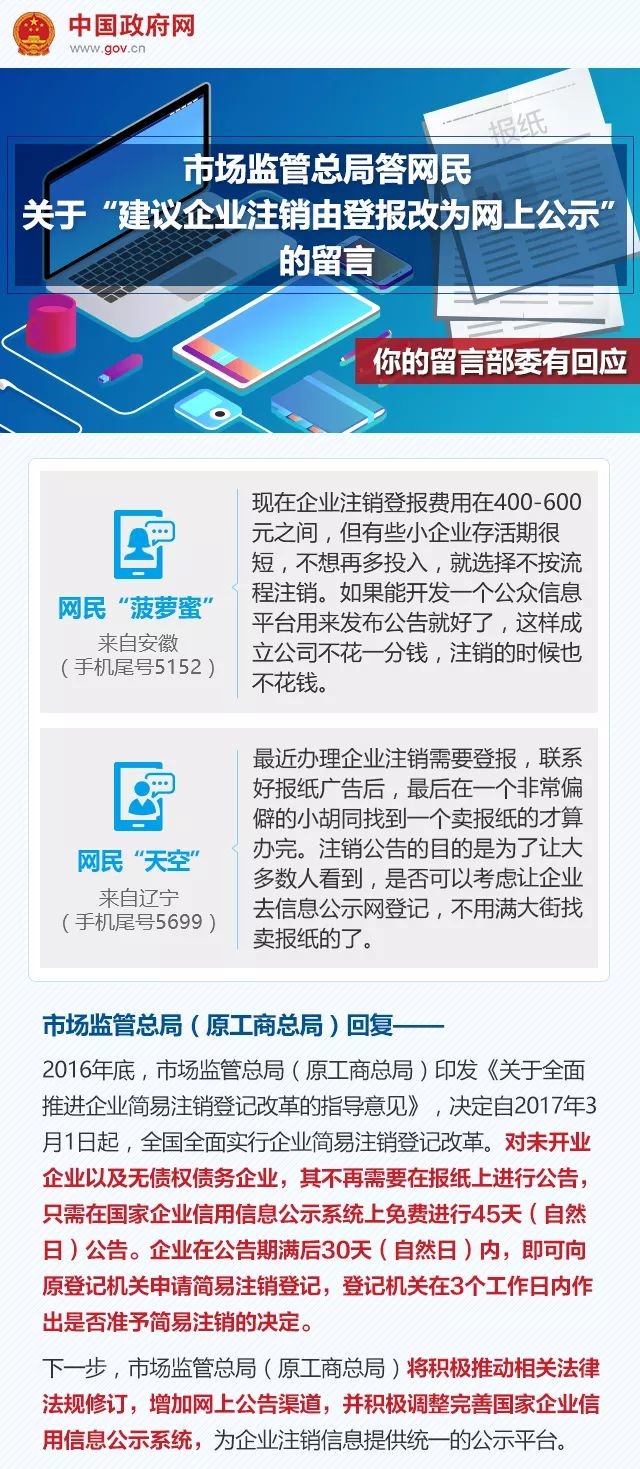 下一步,市場監管總局(原工商總局)將積極推動相關法律法規修訂,增加網上公告渠道,并積極調整完善國家企業信用信息公示系統,為企業注銷信息提供統一的公示平臺,以方便社會公眾查詢,降低各類市場主體的辦事成本,滿足群眾需要。