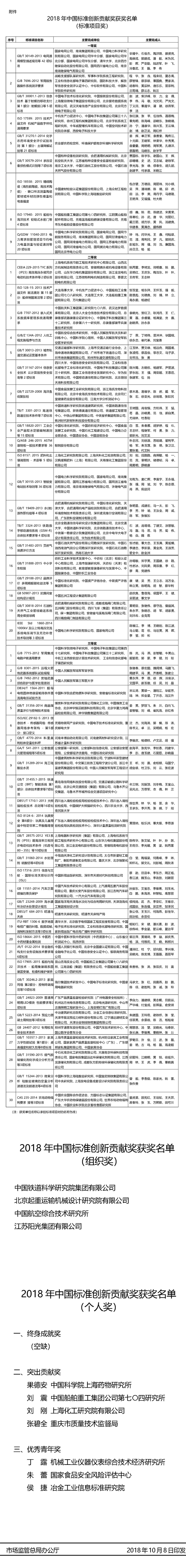 國家市場監(jiān)督管理總局、國家標準化管理委員會近日公布2018年中國標準創(chuàng)新貢獻獎獲獎名單,對在經(jīng)濟社會發(fā)展中發(fā)揮重要作用的標準,以及在國際國內(nèi)標準化工作中作出顯著成績的單位和個人進行表彰。