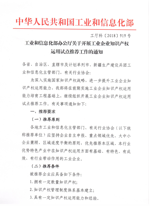 工信部辦公廳關(guān)于開展工業(yè)企業(yè)知識(shí)產(chǎn)權(quán)運(yùn)用試點(diǎn)推薦工