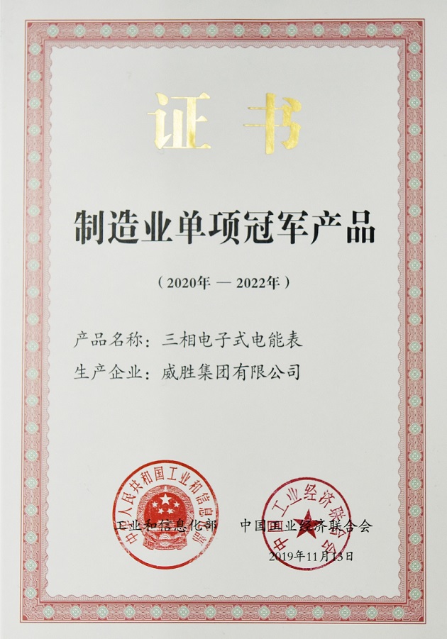 10月25日,國家工業和信息化部發布《擬公布的第四批及擬通過復核的第一批制造業單項冠軍名單公示》,威勝集團三相電子式電能表成功入選第四批制造業單項冠軍產品。