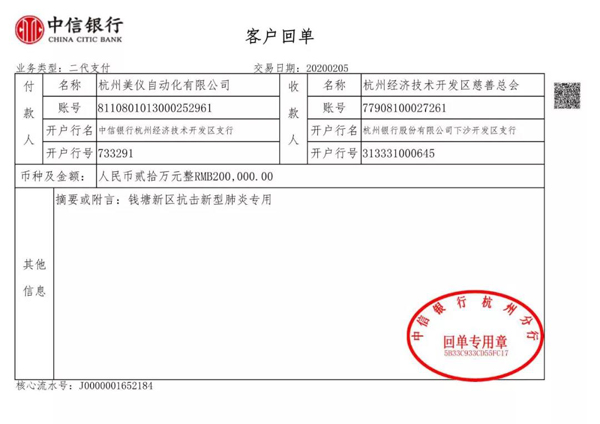2月5日,杭州美儀自動化有限公司向杭州經(jīng)濟技術開發(fā)區(qū)慈善總會捐贈20萬元支援疫情一線。