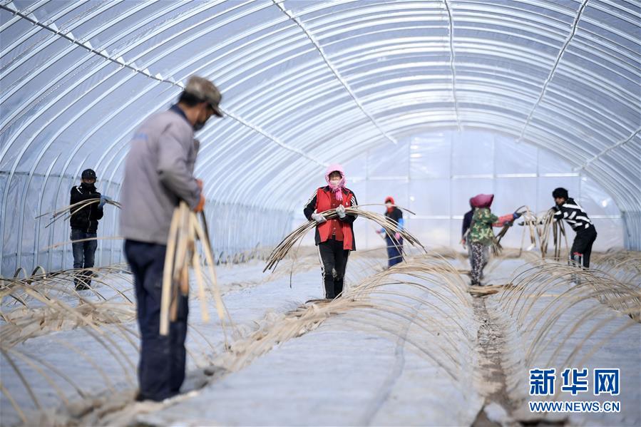 農(nóng)戶在寧夏銀川市賀蘭縣立崗鎮(zhèn)蘭豐村村集體育苗溫室項(xiàng)目打理秧苗(2月22日攝)。