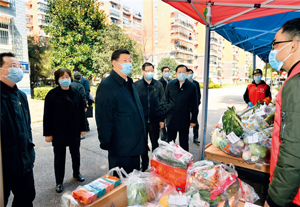 2020年3月10日,中共中央總書記、國家主席、中央軍委主席習近平專門赴湖北省武漢市考察新冠肺炎疫情防控工作。這是習近平在東湖新城社區(qū)生活物資集中配送點,詳細詢問社區(qū)群眾生活物資采購和供應情況。 新華社記者 謝環(huán)馳/攝