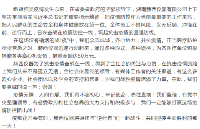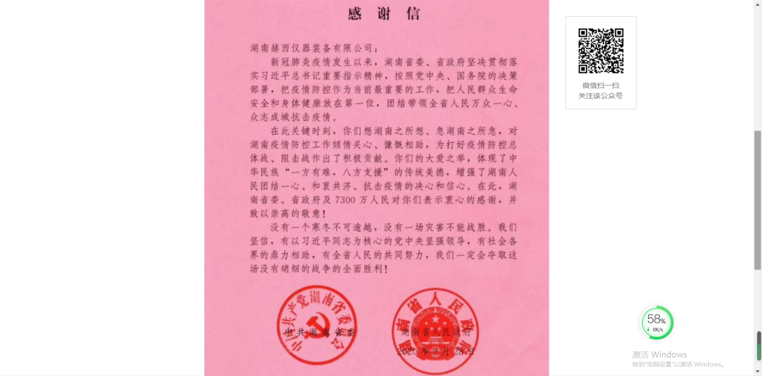 暖心!赫西儀器收到一封來自湖南省委、省政府的感謝信
