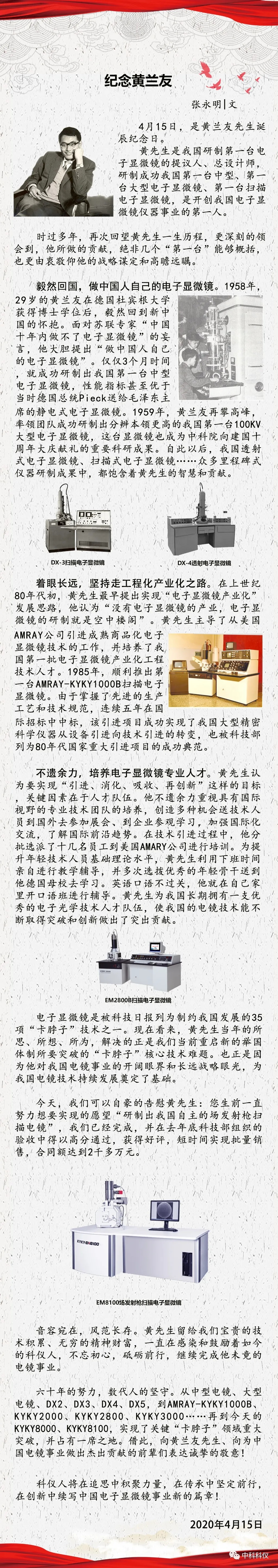 編者按:415日是黃蘭友先生誕辰91周年。黃先生是我國研制第一臺電子顯微鏡的提議人、總設計師,研制成功我國第一臺中型、第一臺大型電子顯微鏡、第一臺掃描電子顯微鏡,是開創我國電子顯微鏡儀器事業的第一人。