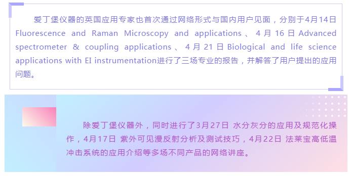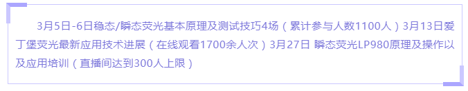 本次千里行期間分析產品共舉辦了15場網絡講座,內容覆蓋了紫外、熒光、拉曼、水分灰分儀、高低溫沖擊系統等多種產品,共計4500人次參與活動,受到了用戶的廣泛好評。雖然不能見面,卻通過網絡拉近了與用戶之間的聯系,解決用戶實際問題的同時,也讓我們更加密切的了解到用戶對于儀器未來使用的一些需求,促進我們更加努力的完善各項服務。下面展現一下活動情況。