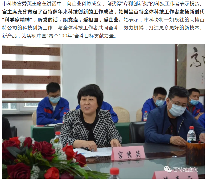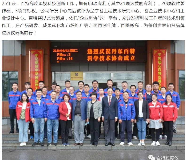 丹東百特儀器有限公司是中國儀器儀表行業(yè)協(xié)會(huì)會(huì)員單位,主要產(chǎn)品:智能激光粒度儀,顯微圖像粒度粒形分析儀,粉體綜合特性測試儀,沉降粒度儀,光阻法顆粒計(jì)數(shù)器,PM2.5監(jiān)測儀,光阻法粒徑譜儀。為提升公司的創(chuàng)新能力,6月2日,丹東百特儀器有限公司隆重召開丹東百特科學(xué)技術(shù)協(xié)會(huì)成立暨第一次會(huì)員會(huì)議,丹東市科協(xié)主席宮秀英、副主席劉勇等領(lǐng)導(dǎo)到會(huì)祝賀,百特公司董事長、總經(jīng)理董青云,副總經(jīng)理劉忠蘭等會(huì)員參加會(huì)議。