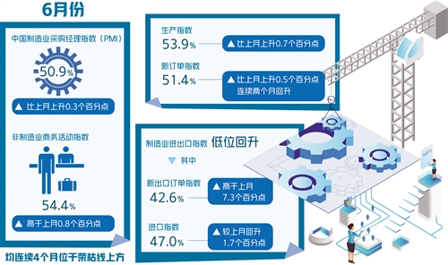 6月30日,國家統(tǒng)計局服務(wù)業(yè)調(diào)查中心和中國物流與采購聯(lián)合會發(fā)布了中國制造業(yè)采購經(jīng)理指數(shù)(PMI)。6月份,制造業(yè)PMI為50.9%,比上月上升0.3個百分點,連續(xù)4個月位于榮枯線上方;非制造業(yè)PMI為54.4%,比上個月擴大0.8個百分點。