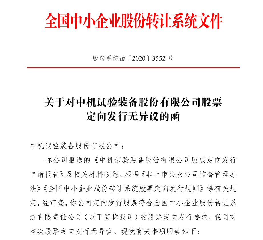 2020年12月25日,中機試驗裝備股份有限公司(以下簡稱中機試驗)成功發行1975萬股,募集資金1億元,圓滿完成2020年股票發行工作。