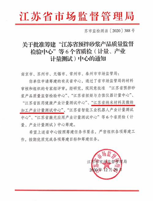 12月29日,江蘇省市場監督管理局發文(蘇市監檢測函[2020]388號),同意在蘇州市計量測試院的基礎上籌建江蘇省納米材料及微納加工產業計量測試中心。