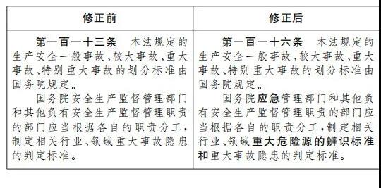 三十六、將第一百一十三條改為第一百一十六條,第二款修改為:“國務院應急管理部門和其他負有安全生產監督管理職責的部門應當根據各自的職責分工,制定相關行業、領域重大危險源的辨識標準和重大事故隱患的判定標準。”