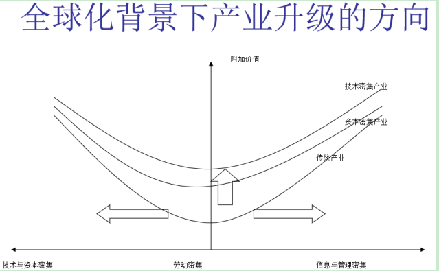 這條三條線代表不同的產(chǎn)業(yè),最低的是傳統(tǒng)產(chǎn)業(yè),往上是資本密集產(chǎn)業(yè)、技術(shù)密集產(chǎn)業(yè)。在同等價格環(huán)節(jié)上,它們都會有一個升級的過程。縱向是傳統(tǒng)產(chǎn)業(yè)升級,叫產(chǎn)業(yè)間的升級。因為有了全球價值鏈,一個國家的升級有了兩個新的方向,在微笑曲線向兩端升級,就是從低附加價值環(huán)節(jié)向上游研發(fā)和復雜零部件生產(chǎn)升級,以及向下游去做服務、做品牌。在新的全球化背景下,一個國家的升級有了三個方向,既有傳統(tǒng)的產(chǎn)業(yè)間升級,同時又有了價值鏈的升級。這是我們討論全球價值鏈帶來的一個很重要的新思路。