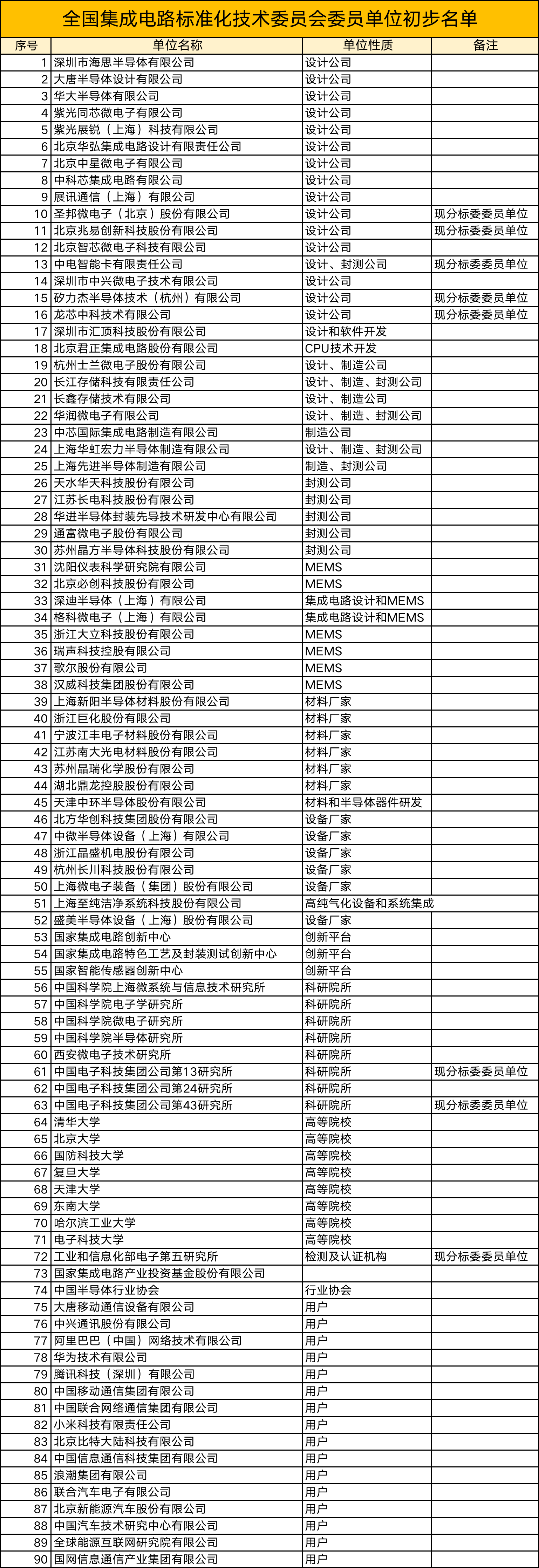 全國集成電路標(biāo)準(zhǔn)化技術(shù)委員會(huì)(以下簡稱“標(biāo)委會(huì)”)成立大會(huì)暨一屆一次全體委員會(huì)議4月6日在京召開。會(huì)議宣布了集成電路標(biāo)委會(huì)委員名單,目前,官方尚未公布標(biāo)委會(huì)名單,2021年工信部曾公開籌建名單(見下圖)。對外公開的委員單位包括漢威科技、沈陽儀表院等90家。