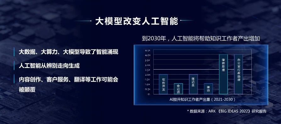 那么這樣會(huì)導(dǎo)致什么呢?導(dǎo)致人們的工作效率大幅度地提升。比如說,在內(nèi)容創(chuàng)作、客戶服務(wù)、翻譯這些工作,它的效率會(huì)大幅度地提升。所以我們也看到,很多研究機(jī)構(gòu)都認(rèn)為,在未來的10年,很多工作它的效率會(huì)成倍成倍的提升。同時(shí)也帶來一些擔(dān)心,是不是這樣的效率提升,會(huì)使得很多人的工作就沒了?這些人工作丟掉之后,會(huì)不會(huì)給我們?nèi)祟悗聿豢深A(yù)知的問題。