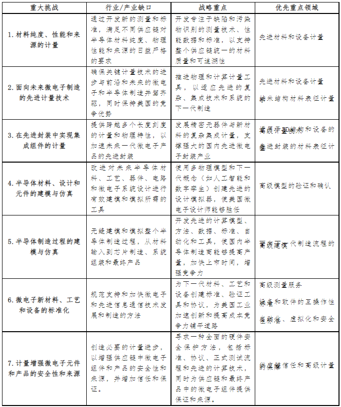 2022年9月的《美國半導體行業的戰略機遇》報告中,確定了從計量學角度需要重點關注的7大挑戰,以實現美國領導的全球半導體行業的未來國家愿景。到2022年11月,芯片研發計量計劃將其投資組合進一步細化為10個優先重點領域,以解決最關鍵的計量研發缺口。七大挑戰及對應優先重點領域如下: