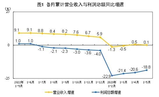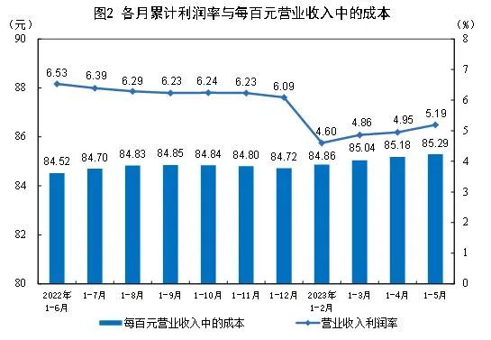 1—5月份,規(guī)模以上工業(yè)企業(yè)實(shí)現(xiàn)營(yíng)業(yè)收入51.39萬(wàn)億元,同比增長(zhǎng)0.1%;發(fā)生營(yíng)業(yè)成本43.83萬(wàn)億元,增長(zhǎng)1.2%;營(yíng)業(yè)收入利潤(rùn)率為5.19%,同比下降1.21個(gè)百分點(diǎn)。