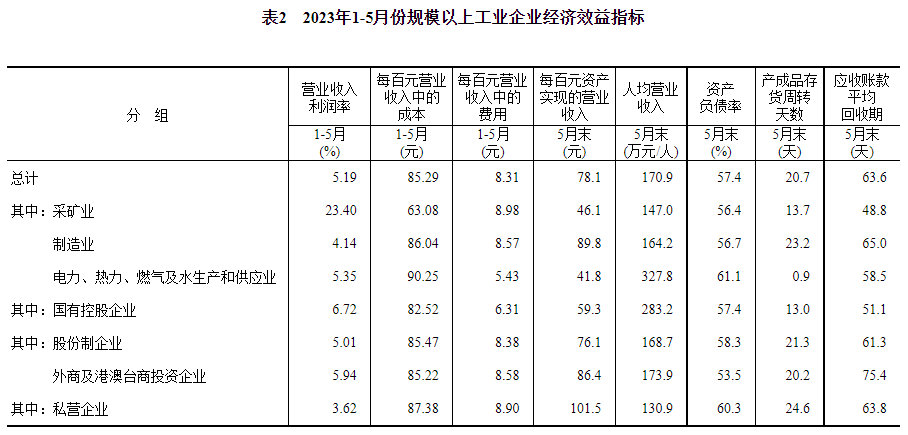 5月末,規(guī)模以上工業(yè)企業(yè)每百元資產(chǎn)實(shí)現(xiàn)的營(yíng)業(yè)收入為78.1元,同比減少5.8元;人均營(yíng)業(yè)收入為170.9萬(wàn)元,同比增加5.8萬(wàn)元;產(chǎn)成品存貨周轉(zhuǎn)天數(shù)為20.7天,同比增加1.0天;應(yīng)收賬款平均回收期為63.6天,同比增加6.4天。