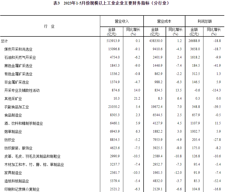 1—5月份,在41個(gè)工業(yè)大類行業(yè)中,14個(gè)行業(yè)利潤(rùn)總額同比增長(zhǎng),1個(gè)行業(yè)持平,24個(gè)行業(yè)下降,2個(gè)行業(yè)由盈轉(zhuǎn)虧。主要行業(yè)利潤(rùn)情況如下:電力、熱力生產(chǎn)和供應(yīng)業(yè)利潤(rùn)總額同比增長(zhǎng)45.9%,電氣機(jī)械和器材制造業(yè)增長(zhǎng)29.2%,汽車制造業(yè)增長(zhǎng)24.3%,通用設(shè)備制造業(yè)增長(zhǎng)23.4%,專用設(shè)備制造業(yè)下降0.1%,石油和天然氣開采業(yè)下降9.9%,煤炭開采和洗選業(yè)下降18.7%,非金屬礦物制品業(yè)下降25.9%,紡織業(yè)下降27.8%,農(nóng)副食品加工業(yè)下降39.5%,計(jì)算機(jī)、通信和其他電子設(shè)備制造業(yè)下降49.2%,化學(xué)原料和化學(xué)制品制造業(yè)下降52.4%,有色金屬冶煉和壓延加工業(yè)下降53.0%,石油、煤炭及其他燃料加工業(yè)下降92.8%,黑色金屬冶煉和壓延加工業(yè)由盈利轉(zhuǎn)為虧損。