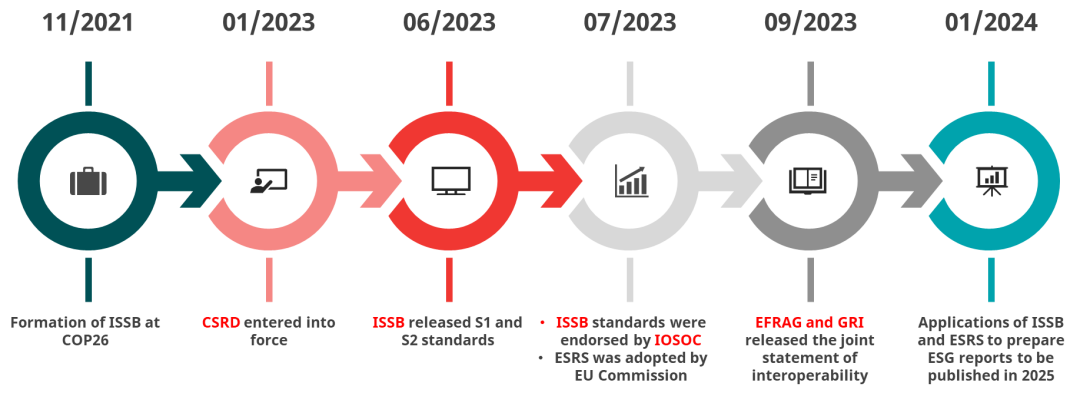 * 2023年6月26日,國際可持續(xù)準則理事會(ISSB)發(fā)布了首批兩項可持續(xù)報告披露準則S1(一般要求準則)和S2(氣候披露準則)。