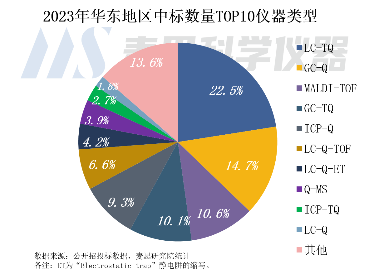 2023年華東地區中標數量Top10儀器類型分別為LC-TQ、GC-Q、MALDI-TOF、GC-TQ、ICP-Q、LC-Q-TOF、LC-Q-ET、Q-MS、ICP-TQ和LC-Q,合計中標數量占比86.4%。