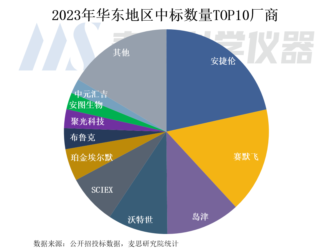 華東地區質譜儀器中標數量Top 5企業分別為安捷倫、賽默飛、島津、沃特世和SCIEX,Top 5占比超65%。國內廠商中,聚光科技、安圖生物和中元匯吉三家企業進入Top 10行列。