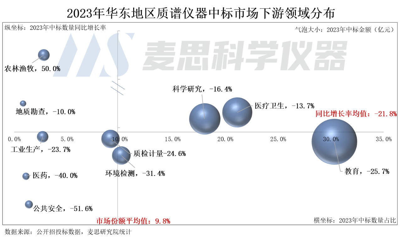 教育領域的用戶為學校,2023年中標數量占全國質譜儀器中標市場約30%,是目前華東地區質譜儀器中標市場最大采購群體。