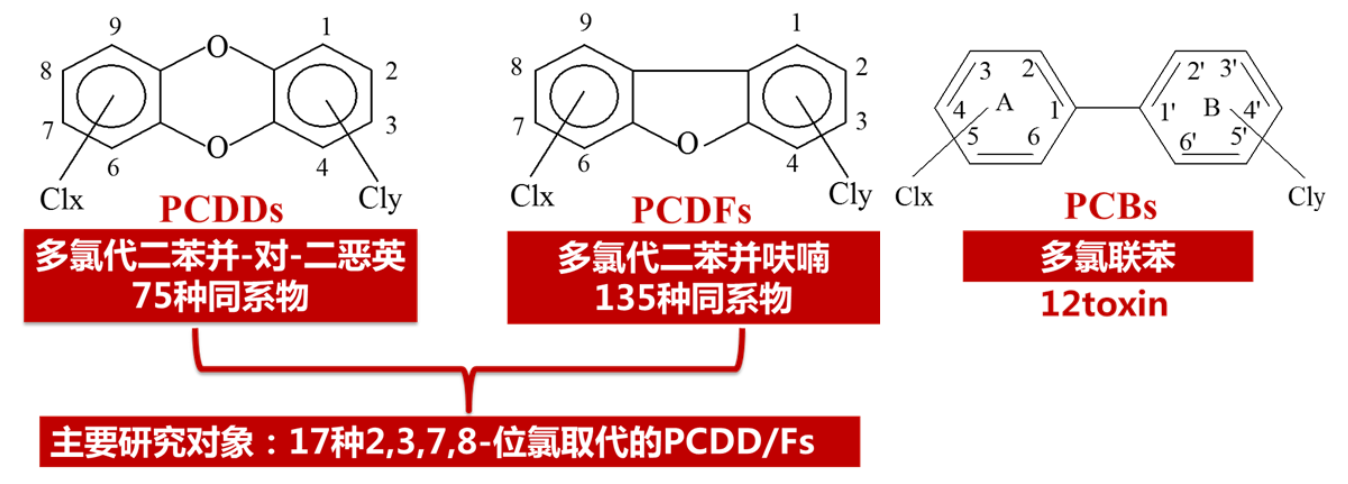 二噁英及其類似物是一類含有苯環(huán)結(jié)構(gòu)的特定有機化合物的總稱,包括多氯代二苯并二噁英(PCDDs)和多氯代二苯并呋喃(PCDFs)和類二噁英多氯聯(lián)苯(DL-PCBs)等,具有持久性、生物富集、長距離遷移和生物毒性等特點。其中以17種2,3,7,8位氯取代的PCDD/Fs和12種DL-PCBs同族體被認為對人類和生物危害最嚴重。