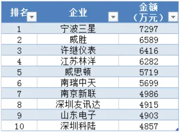 B級(jí)三相智能電能表中標(biāo)金額前十企業(yè)