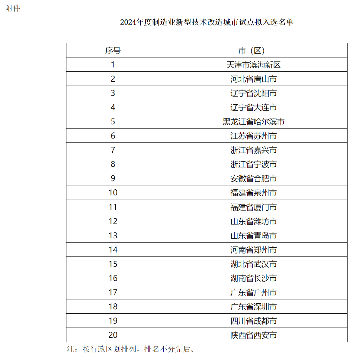 429日,工信部公示2024年度制造業新型技術改造城市試點擬入選名單,共計20個,公示期為2024429日-202459日。
