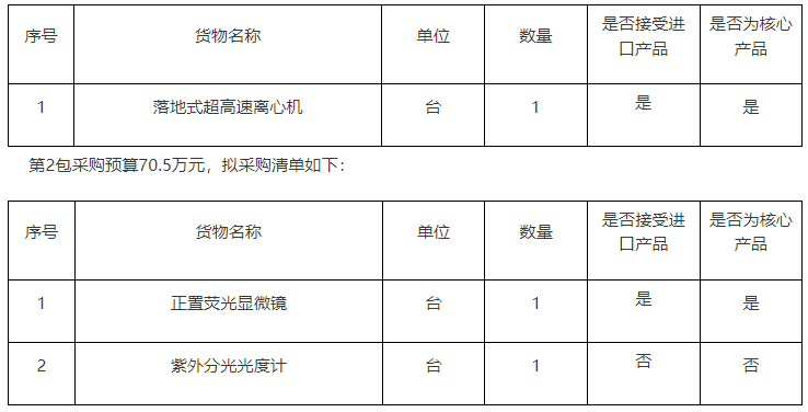 華中師范大學(xué)落地式超高速離心機(jī)、正置熒光顯微鏡、紫外分光光度計(jì)儀器設(shè)備采購,本項(xiàng)目劃分為2個(gè)包,第1包采購預(yù)算77萬元,擬采購清單如下: