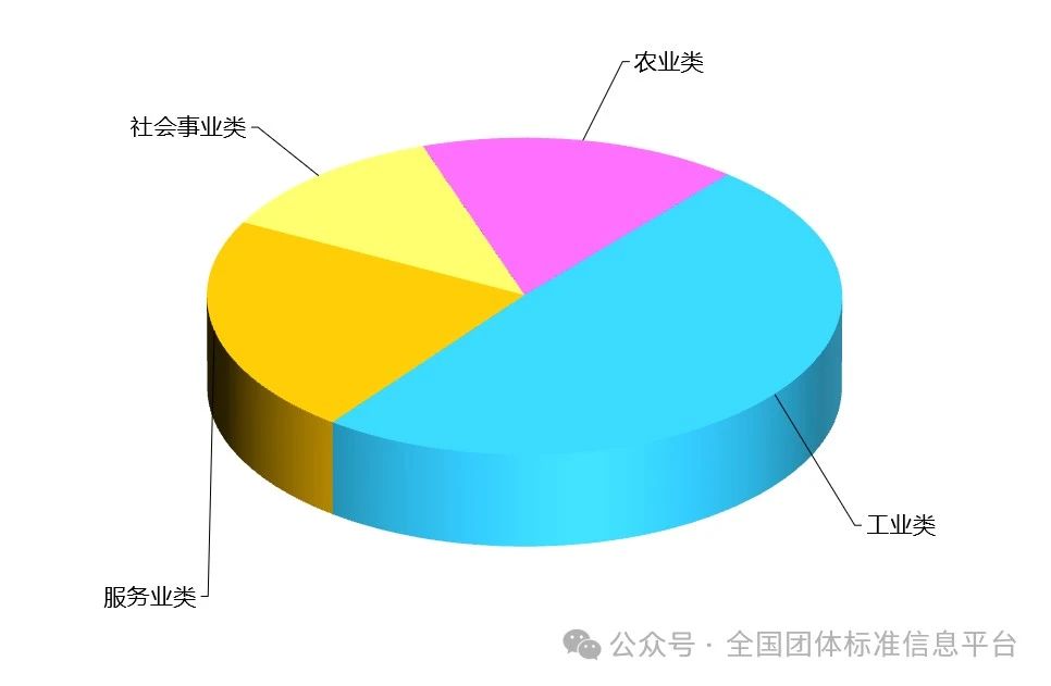 截至2024630日,從產業和社會分布來看,社會團體公布的團體標準中工業類共41629項標準,占比49.14%;服務業類共18932項標準,占比22.35%;農業類共13828項標準,占比16.32%;社會事業類共10317項標準,占比12.19%。