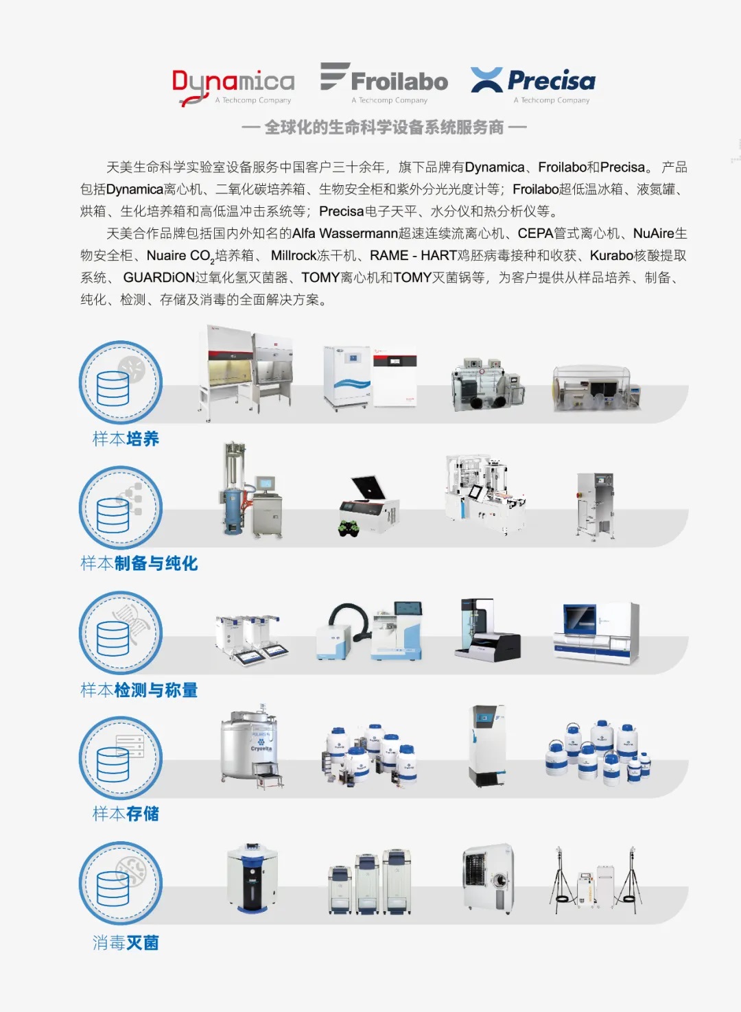 天美合作品牌包括國內外知名的Alfa Wassermann超速連續流離心機、CEPA管式離心機、NuAire生物安全柜、Nuaire CO2培養箱、Millrock凍干機、RAME - HART雞胚病毒接種和收獲、Kurabo核酸提取系統、GUARDiON過氧化氫滅器、TOMY離心機和TOMY滅菌鍋等,為客戶提供從樣品培養、制備、純化、檢測、存儲及消毒的全面解決方案。