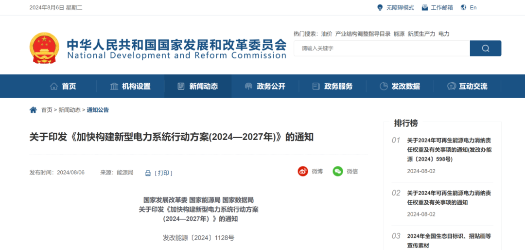 國家發(fā)展改革委、國家能源局、國家數(shù)據(jù)局86日聯(lián)合發(fā)布《加快構(gòu)建新型電力系統(tǒng)行動方案(2024—2027年)》。
