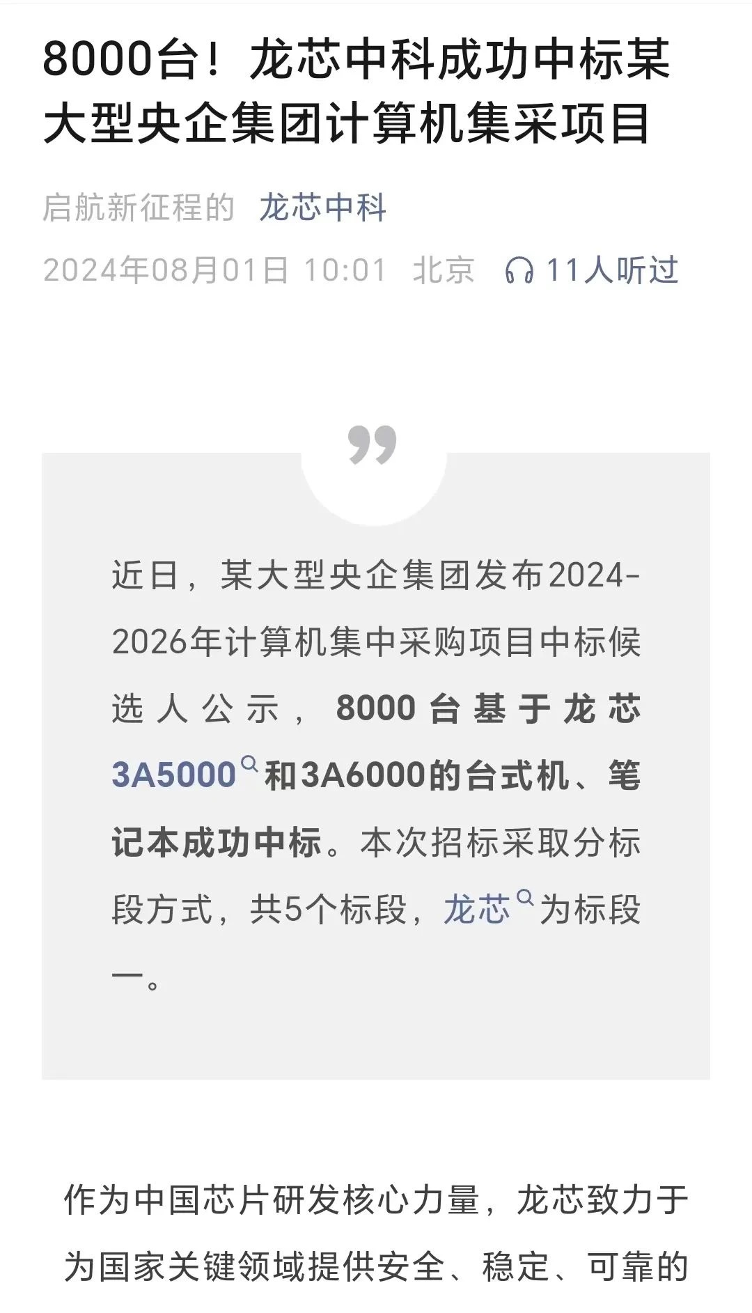 81日,龍芯中科在其官方微信公號中曾發(fā)文稱,近日,某大型央企集團(tuán)發(fā)布2024-2026年計算機(jī)集中采購項目中標(biāo)候選人公示,8000臺基于龍芯3A50003A6000的臺式機(jī)、筆記本成功中標(biāo)。本次招標(biāo)采取分標(biāo)段方式,共5個標(biāo)段,龍芯為標(biāo)段一。