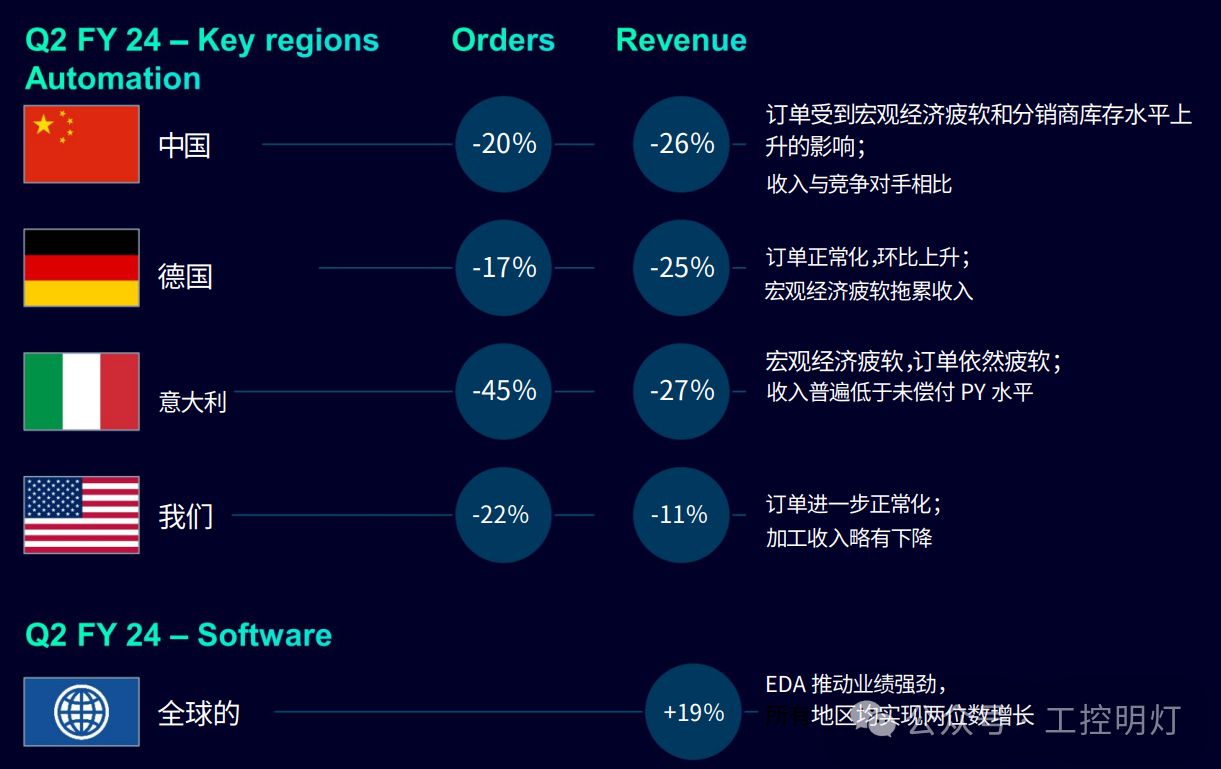 與之前的假設相反,Digital Industries 自動化業(yè)務的客h去庫存化可能會持續(xù)到今年下半年,尤其是在中國。對于 2024 財年下半年,Digital Industries 假設其⾃動化業(yè)務的需求將⽐本財 年上半年有所回升,并預計其軟件業(yè)務將獲得⼤量合同。