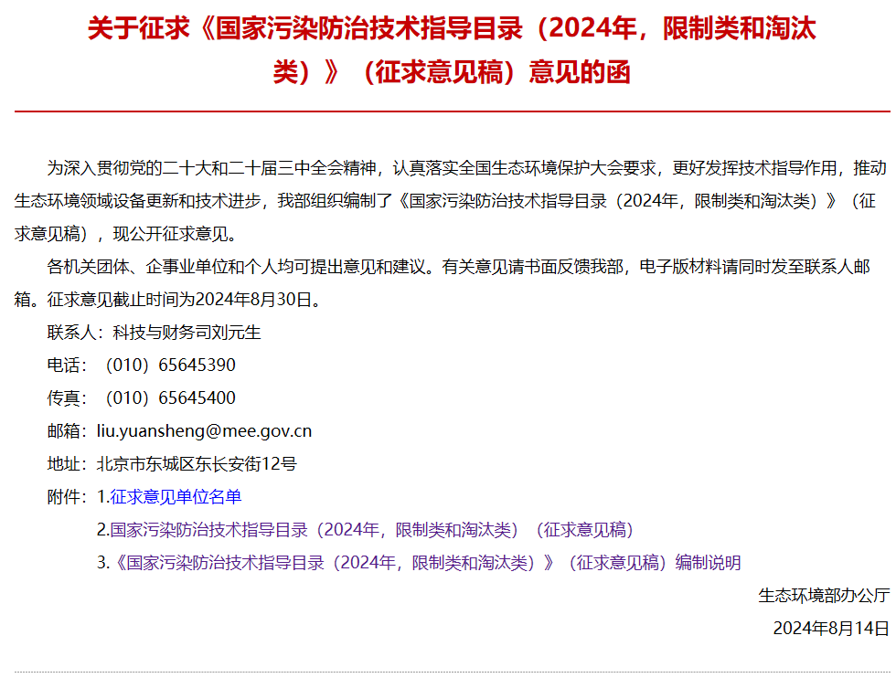 為更好發揮技術指導作用,推動生態環境領域設備更新和技術進步,生態環境部日前發布關于征求《國家污染防治技術指導目錄(2024年,限制類和淘汰類)》(征求意見稿)意見的函,向有關單位征求意見。