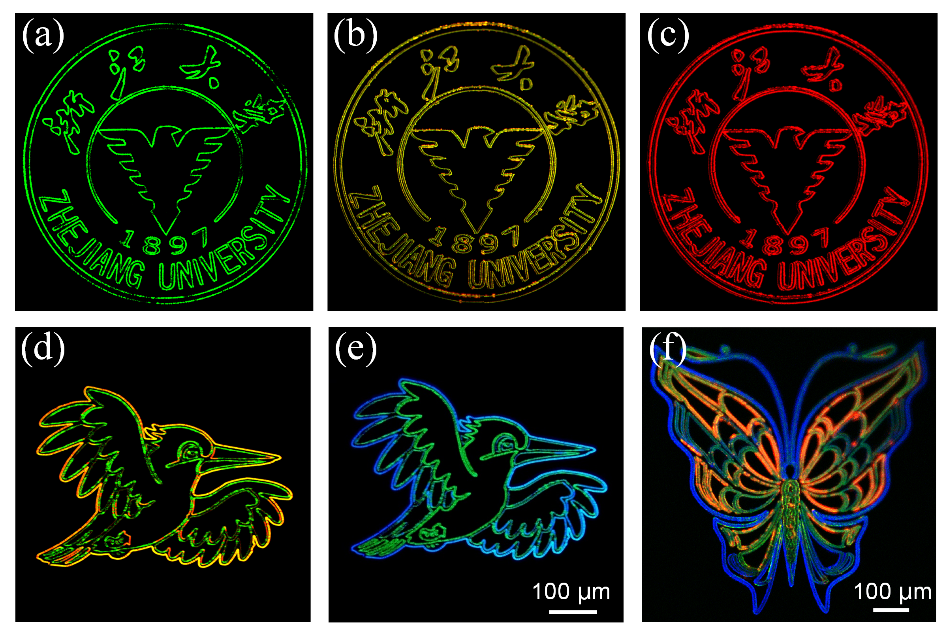 圖3(a)~(c)在玻璃內(nèi)部直寫不同顏色的浙江大學(xué)?;?,(d)~(f)納米晶彩色圖案直寫