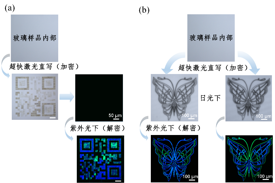 利用超快激光直寫的方法可以在在同一片玻璃內(nèi)部三維直寫發(fā)光波長組合可調(diào)的納米晶圖案,該技術(shù)可以用于創(chuàng)建快速響應(yīng)的二維碼,直寫帶有加密信息的數(shù)據(jù)圖案,如圖6(a)所示?;诩{米晶發(fā)光波長的可調(diào)節(jié)性,在圖案的不同區(qū)域可以指定其發(fā)光色彩(例如藍(lán)色和綠色),且這種顏色分布差異在日光下并不可見,只能在紫外光照射下觀察到。如圖6(b)所示,在日光下直寫的“蝴蝶”圖案沒有顯著差異,但在紫外光下圖案在不同區(qū)域呈現(xiàn)不同顏色。與其它基于鈣鈦礦納米晶的加密標(biāo)簽相比,玻璃中直寫的納米晶具有顯著的光穩(wěn)定性和熱穩(wěn)定性,更加適用于關(guān)鍵信息的加密和解密。