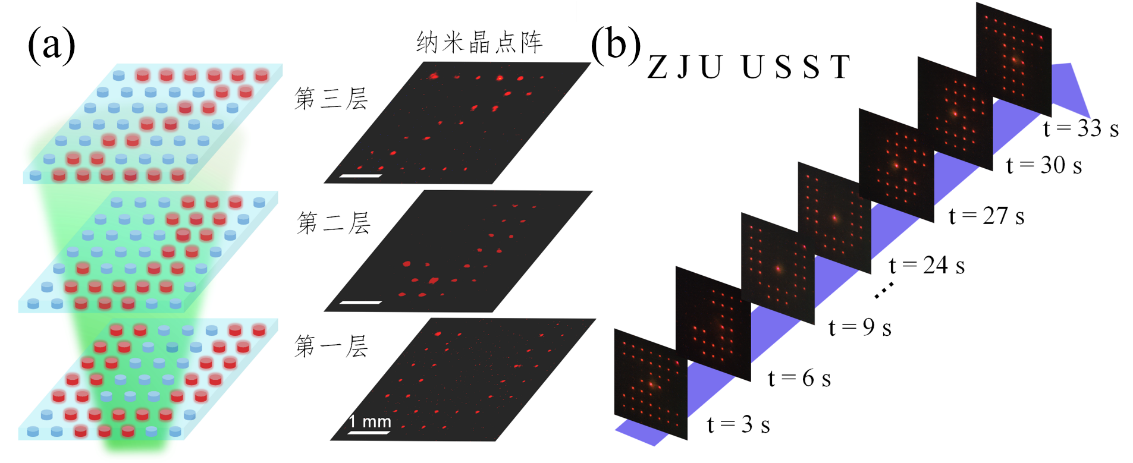 除二維的平面顯示外,該技術(shù)方案還能演示三維的全息顯示器件。將立體的圖案通過空間光調(diào)制器設(shè)計(jì)的全息圖在多個(gè)平面上分層顯示,可以同時(shí)激發(fā)點(diǎn)亮不同層的圖案。如圖 5(a)所示,三幅全息圖像(字母Z、J和U)激發(fā)的熒光圖案在沿激發(fā)光輻照方向上的多個(gè)平面上同時(shí)被構(gòu)建,在不同層顯示了對(duì)應(yīng)的字母Z、J和U的紅色熒光圖案。預(yù)先設(shè)置好的全息圖案的播放時(shí)間和順序,在內(nèi)部具有多個(gè)納米晶發(fā)光單元陣列的玻璃基板上還能實(shí)現(xiàn)動(dòng)態(tài)的全息顯示,如圖5(b)在不同時(shí)刻分別顯示了字母Z、J、U、U、S、S、T的熒光圖案。