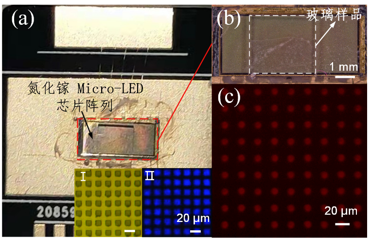 圖4(a)基于玻璃內(nèi)部納米晶發(fā)光單元的micro-LED器件照片,插圖I:GaN micro-LED芯片陣列,插圖II:亮藍(lán)色發(fā)光mciro-LED芯片陣列;(b)圖(a)的放大圖;(d)玻璃內(nèi)部在藍(lán)光激發(fā)下的紅色發(fā)光陣列照片