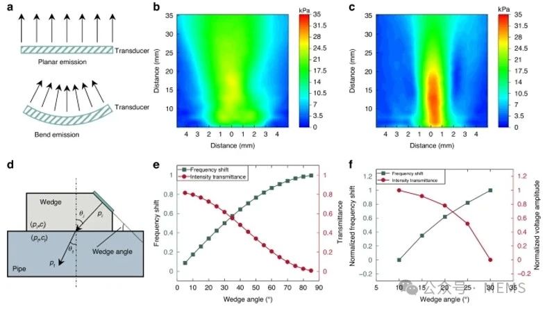 最后,研究人員對集成的傳感單元進行了實驗驗證。如圖5a~c所示,當柔性超聲貼片以曲率半徑為14 mm彎曲時,聲場會產(chǎn)生聚焦效應。在這種情況下,聲壓明顯高于其所在平面狀態(tài)下的聲壓。這種聚焦的聲場已被證明有利于加強對管道內(nèi)污染物的檢測。圖6展示了污染物類型辨別的實驗結果。