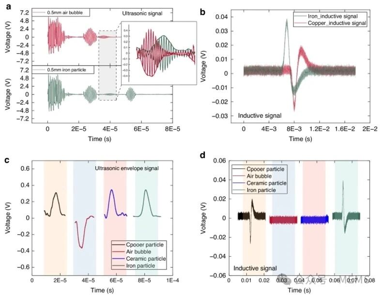 圖1a闡述了檢測原理。管道內(nèi)裝有電磁感應和柔性超聲波傳感單元。傳感單元由三個對稱分布的線圈組成,兩側的兩個線圈采用反向交流激勵。同時,中間線圈利用電磁感應效應監(jiān)測穿過管道的金屬顆粒。此外,楔塊上貼附了柔性超聲貼片。如圖1d所示,不同污染物的電磁感應信號和超聲信號可通過信號處理分別獲得。因此,將兩個傳感單元的時域信號相結合,就能區(qū)分磁性金屬、非磁性金屬、非金屬固體顆粒和氣泡。污染物類型判定規(guī)則如圖1f所示。