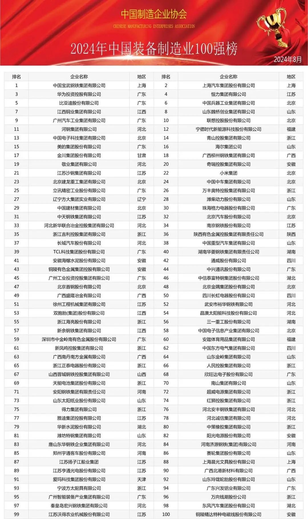 近日,中國(guó)制造企業(yè)協(xié)會(huì)對(duì)外發(fā)布《2024中國(guó)制造業(yè)綜合實(shí)力200強(qiáng)暨中國(guó)裝備制造業(yè)百?gòu)?qiáng)》榜單。