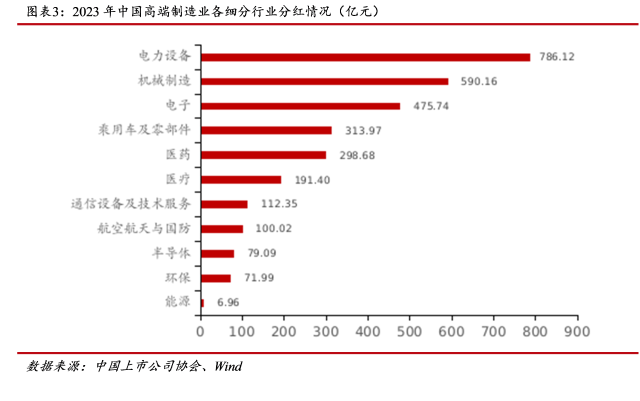 報告顯示,2023年高端制造業上市公司分紅總額為3,026.49億元,較2022年度增加83.01億元,2023年度高端制造業上市公司分紅比例達到37.91%,較2022年度增加4.52個百分點。分紅最高的細分行業為電力設備行業,分紅總額為786.12億元,機械制造及電子行業分紅總額也均超過了450億元,主要原因是電力設備、機械制造和電子行業凈利潤水平在高端制造業中位居前列。